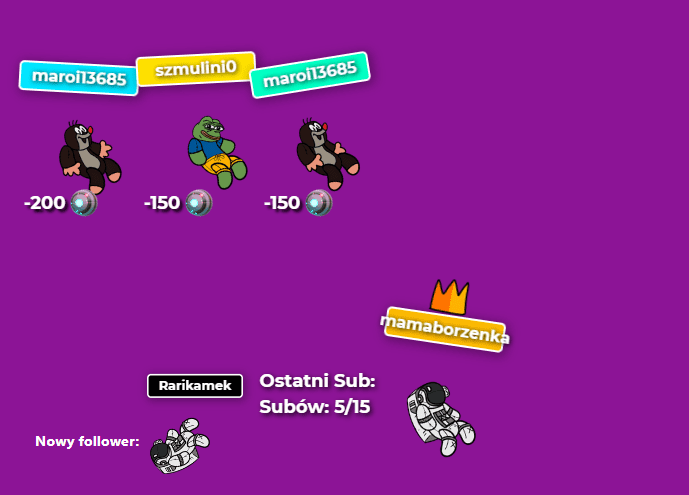 Aplikacja do odczytywania eventów z twitch.tv (follow, subskrypcja), chat bot oraz nakładka na stream obrazująca dane eventy przy pomocy animowanych postaci.